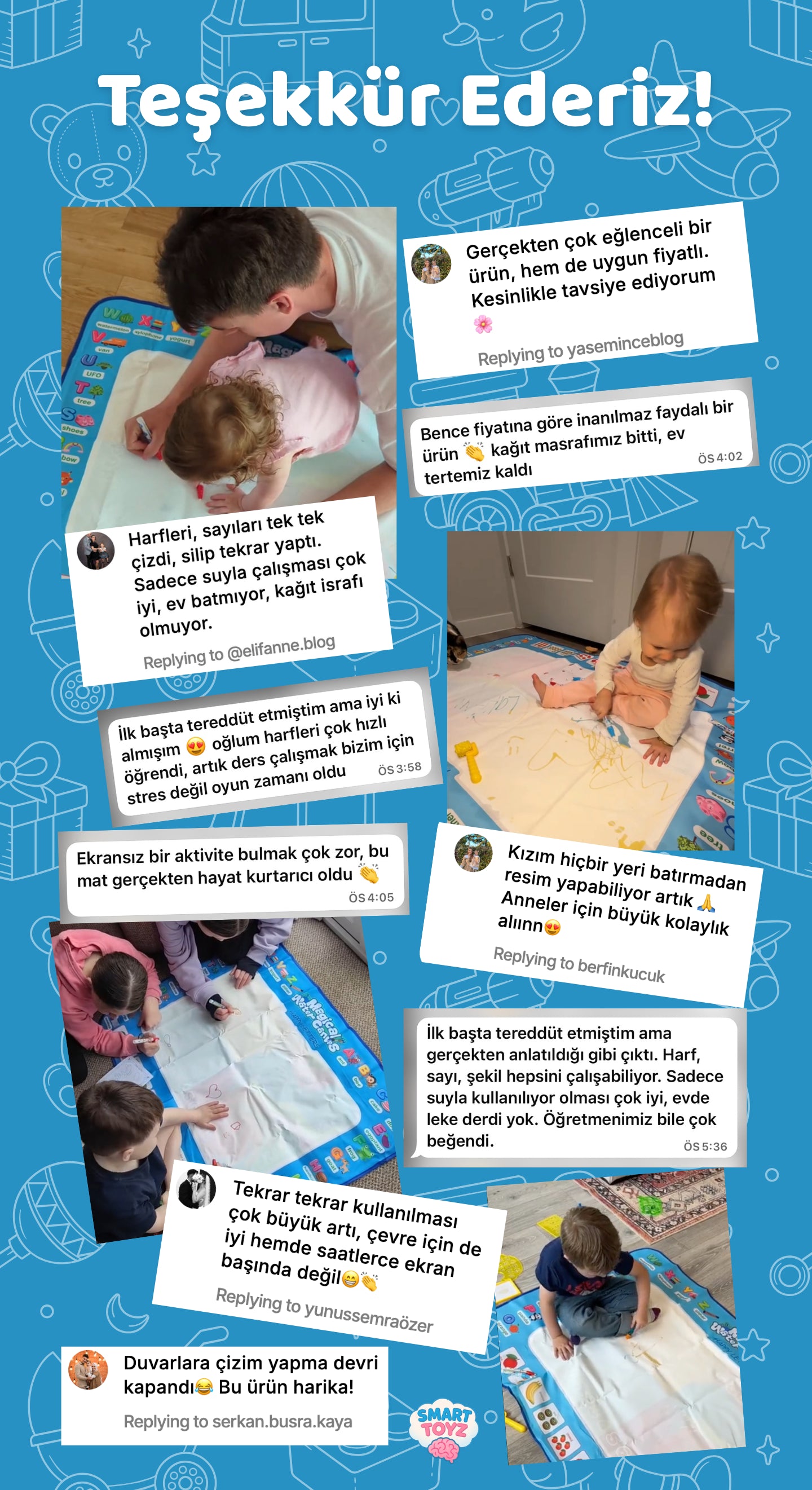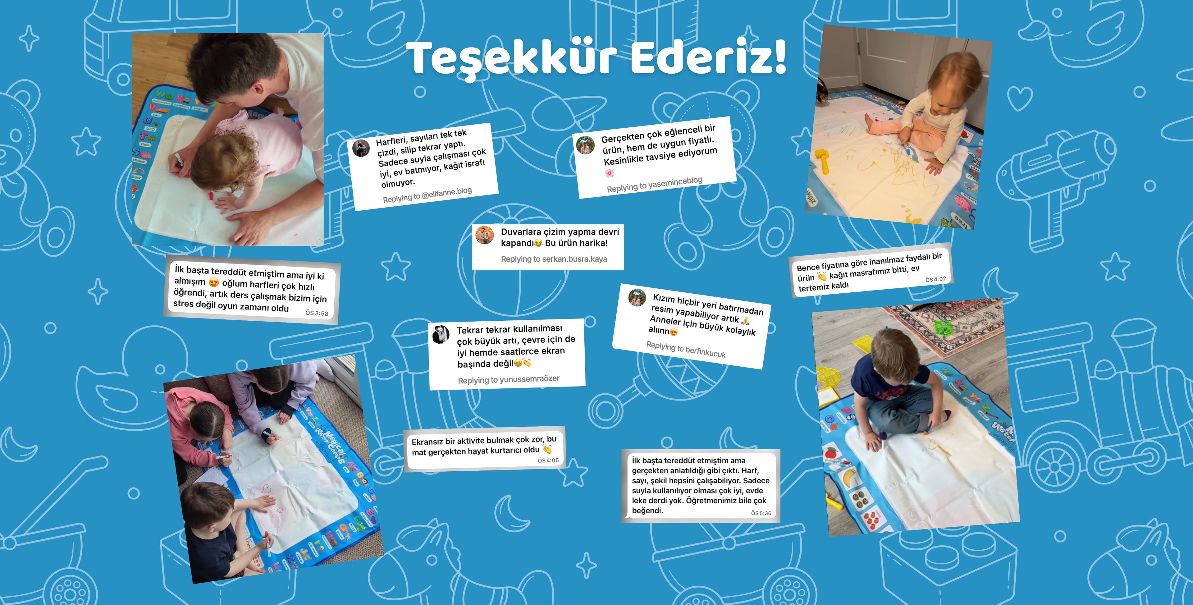 Ürünümüz su bazlı olduğundan 10dk içinde kuruduğunda çizimler kaybolur. Çocuğunuz da oynamaya sorunsuzca tekrar başlayabilir!