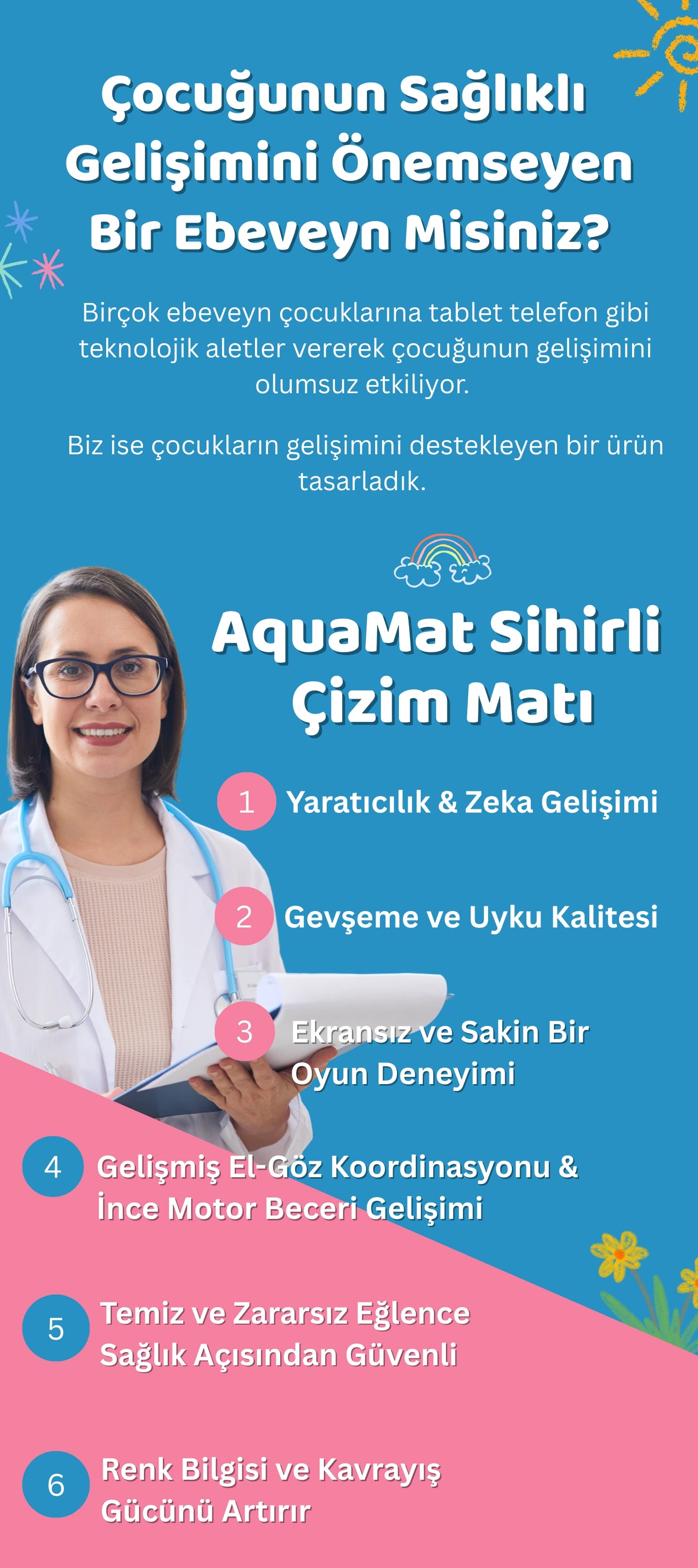 Ürünümüz su bazlı olduğundan 10dk içinde kuruduğunda çizimler kaybolur. Çocuğunuz da oynamaya sorunsuzca tekrar başlayabilir!